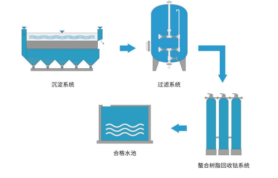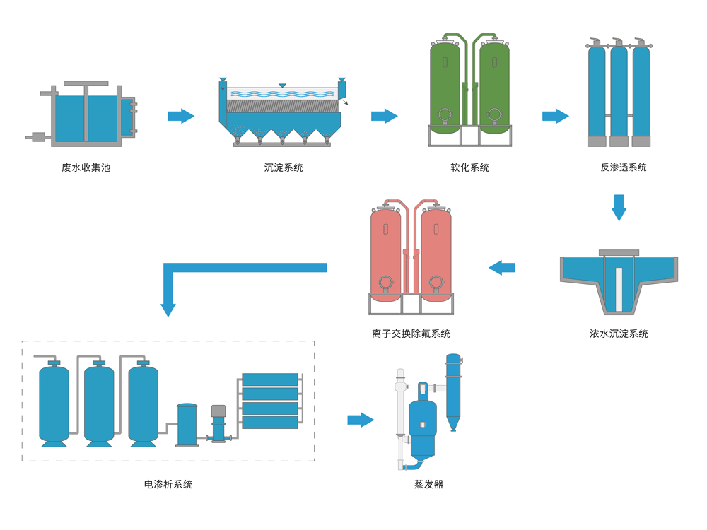 項目名稱 某鋼鐵公司廢水除氟項目 工藝選擇 鋼鐵廢水→沉淀→弱酸陽床→反滲透→濃水除氟樹脂系統→ED→蒸發器 工藝原理 氟選擇性官能團