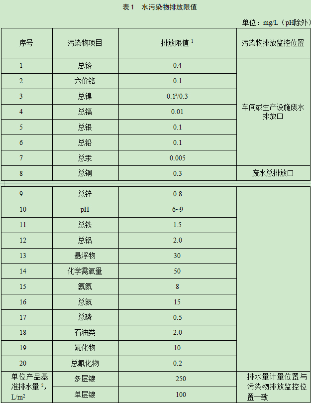 自本文件實施之日起,新建電鍍排污單位、專門處理電鍍廢水的集中式污水處理廠執行表1規定。